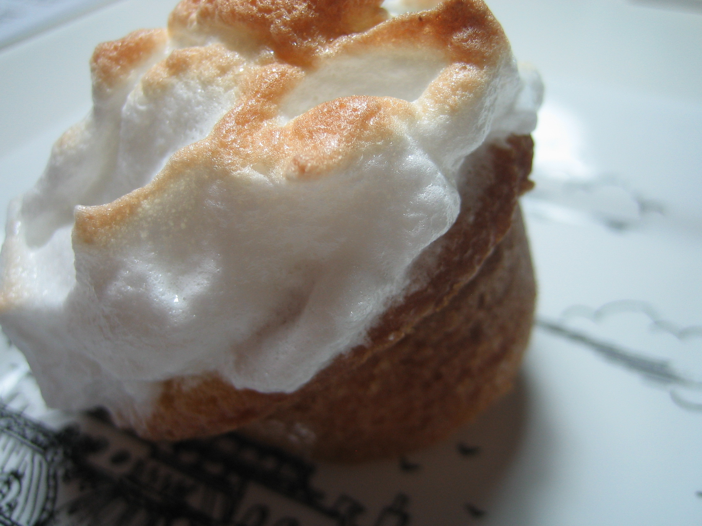 Next, I piped the curd into the open tops of the cupcakes and iced them with Italian meringue. Italian meringue is made with either a hot sugar syrup added to the egg whites or by heating up the egg whites and sugar over a water bath while whipping into stiff peaks. I used this recipe here.